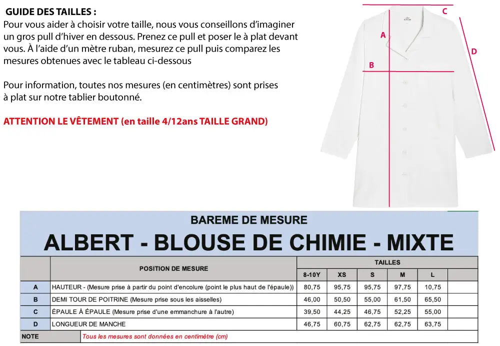 La blouse de chimie ALBERT est une blouse mixte pour collégiens et lycéens.