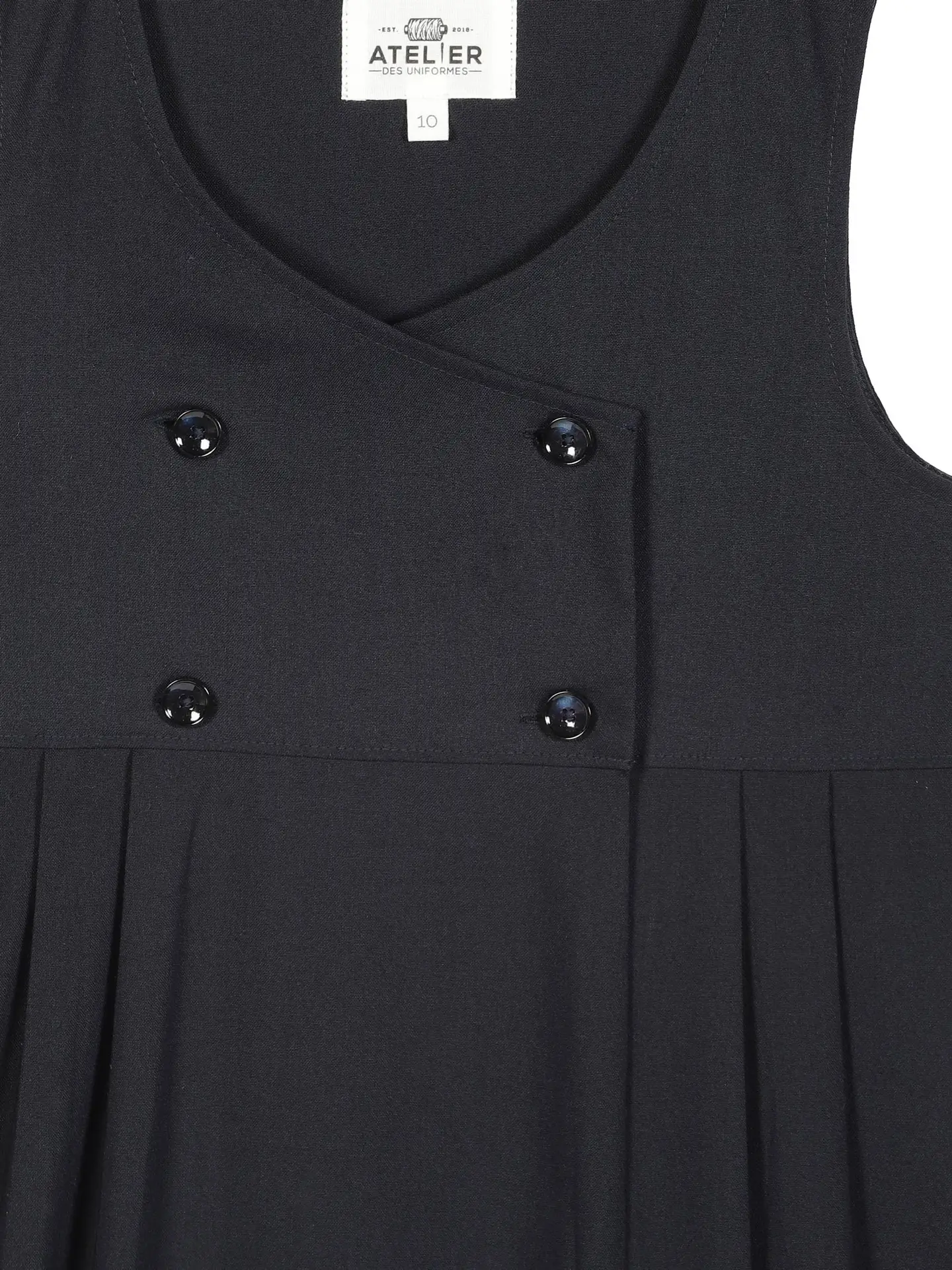 La robe chasuble fille APOLLINE est disponible en bleu marine elle est très confortable et se porte à toutes les saisons pour un look scolaire classique et soigné.