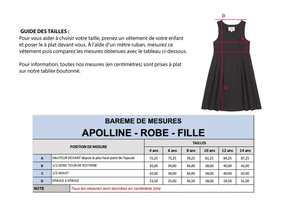 Vous hésitez entre deux tailles ? Notre robe chasuble d’école fille APOLLINE taille normalement. N’hésitez pas à vous référer à notre barème de mesures.