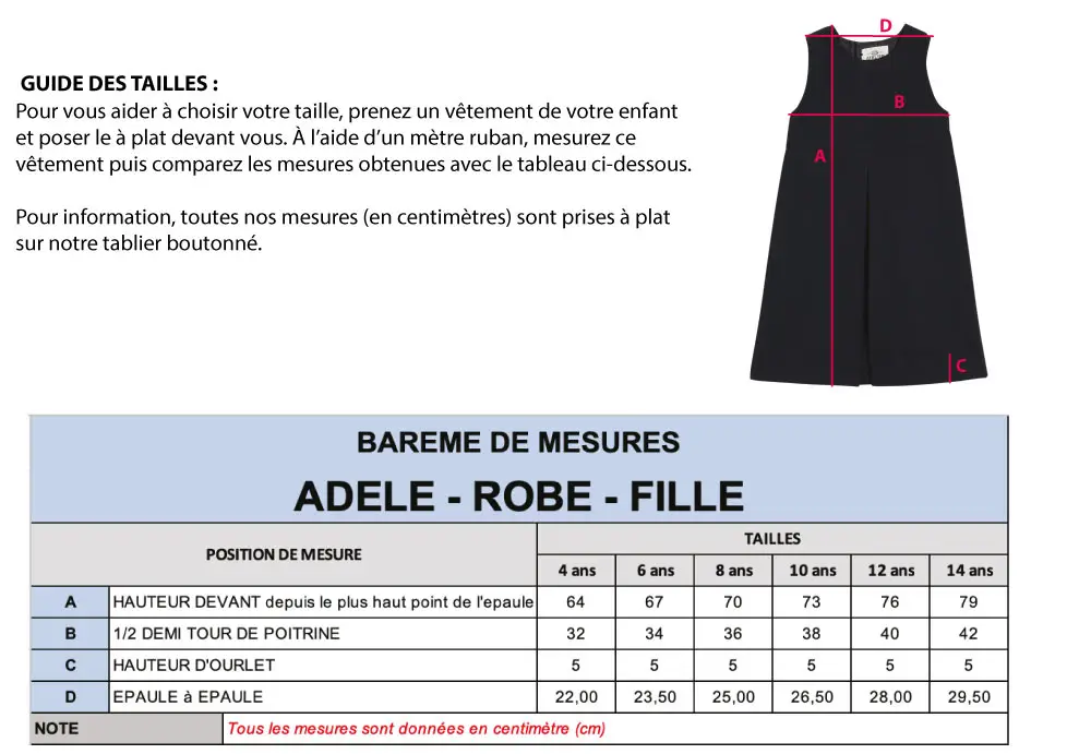 Vous hésitez entre deux tailles ? Notre robe chasuble d’école fille ADÈLE taille normalement. N’hésitez pas à vous référer à notre barème de mesures.