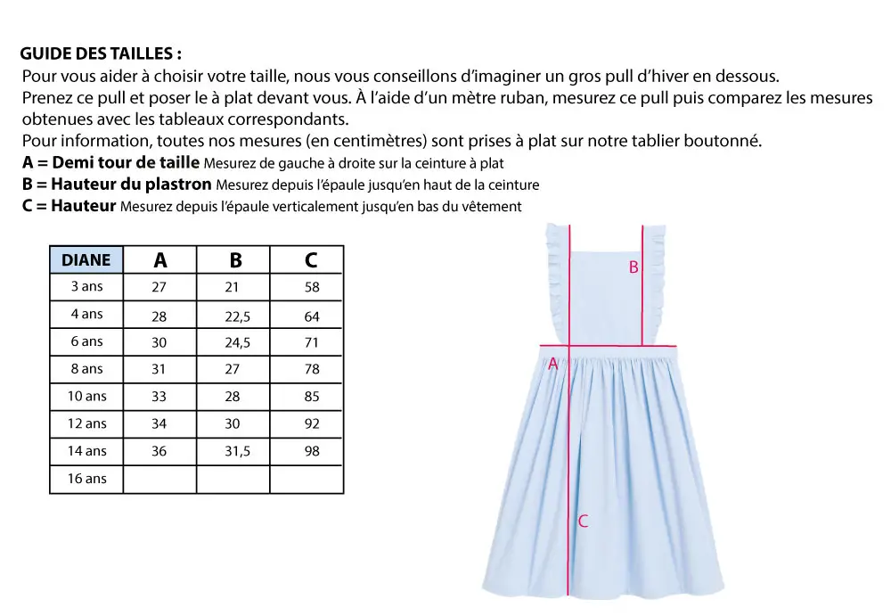 Vous hésitez entre deux tailles ? Le tablier d’école fille DIANE taille normalement. N’hésitez pas à vous référer à notre barème de mesures.