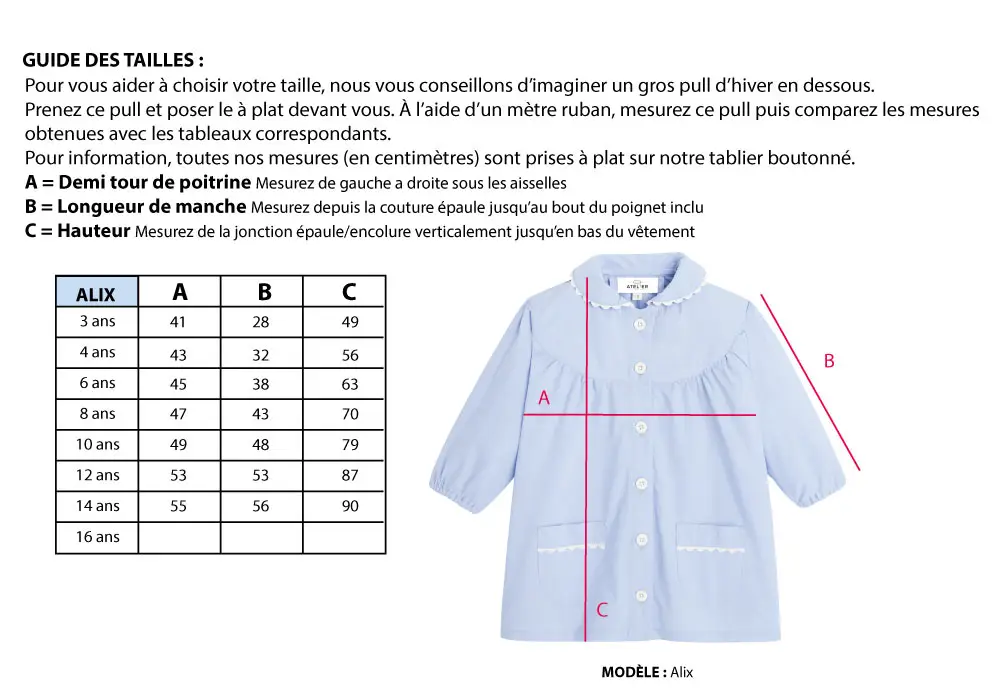 Vous hésitez entre deux tailles ? Nos tabliers et blouses d’école taillent normalement et peuvent être mis sur un pull d’hiver. N’hésitez pas à vous référer à notre guide des tailles. Le tablier ALIX est un tablier long, n’hésitez pas à vous référer à notre barème de mesures.