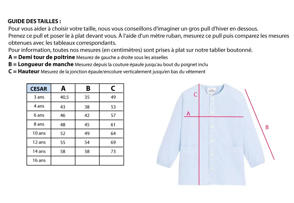 Vous hésitez entre deux tailles ? Le tablier d’école garçon CÉSAR taille normalement. N’hésitez pas à vous référer à notre barème de mesures.