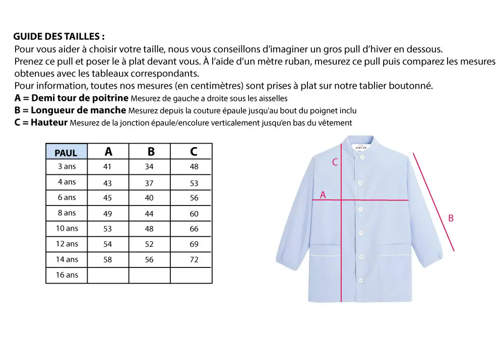 Vous hésitez entre deux tailles ? Nos tabliers et blouses d’école taillent normalement et peuvent être mis sur un pull d’hiver.
