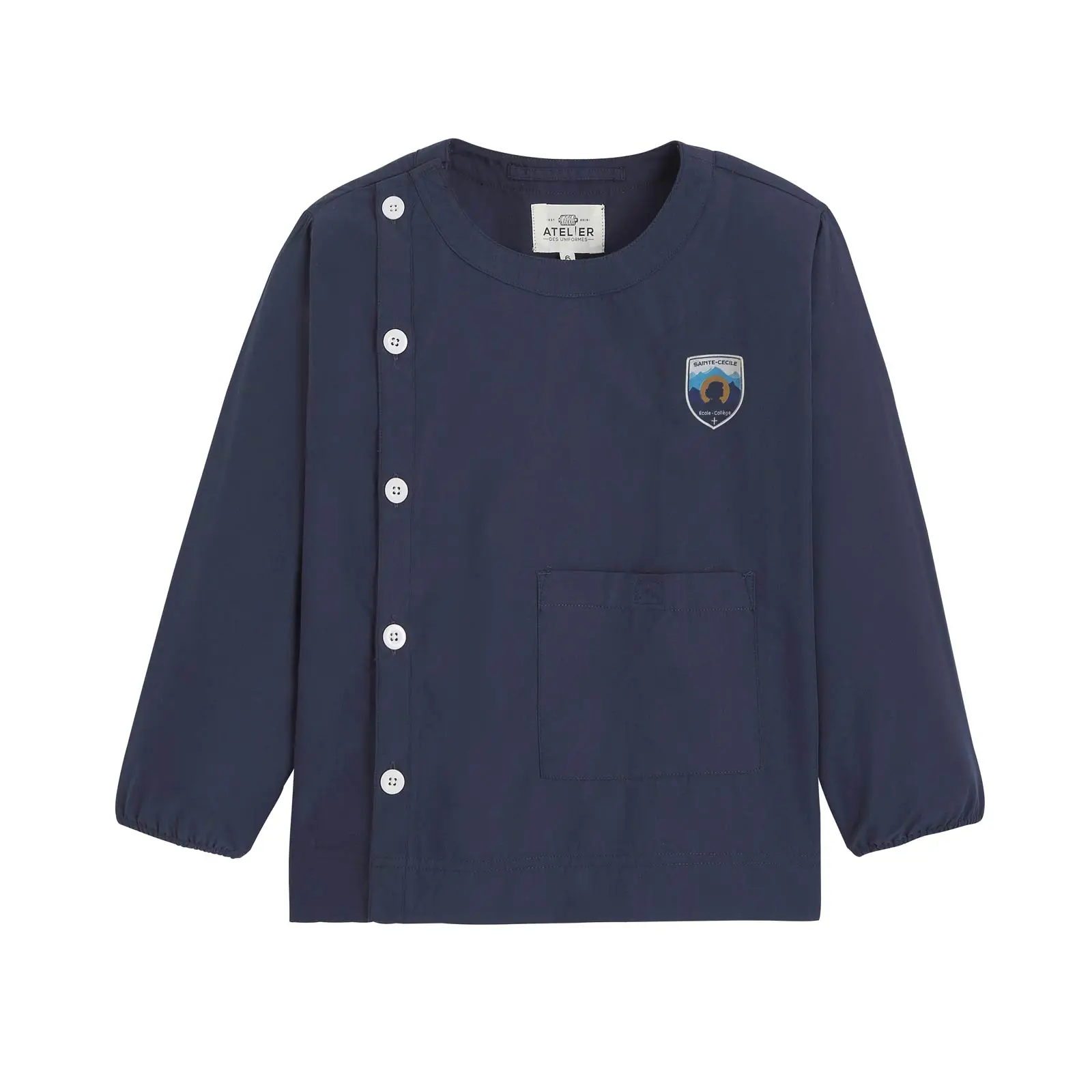 Notre tablier d’école JEAN au col rond et dégarni, a une patte de boutonnage asymétrique sur le devant. Ses poignets sont élastiqués. La poche plaquée sur le devant est renforcée pour éviter tout déchirement. Le cordon cousu sur l’intérieur du col facilite l’accrochage au porte-manteau.