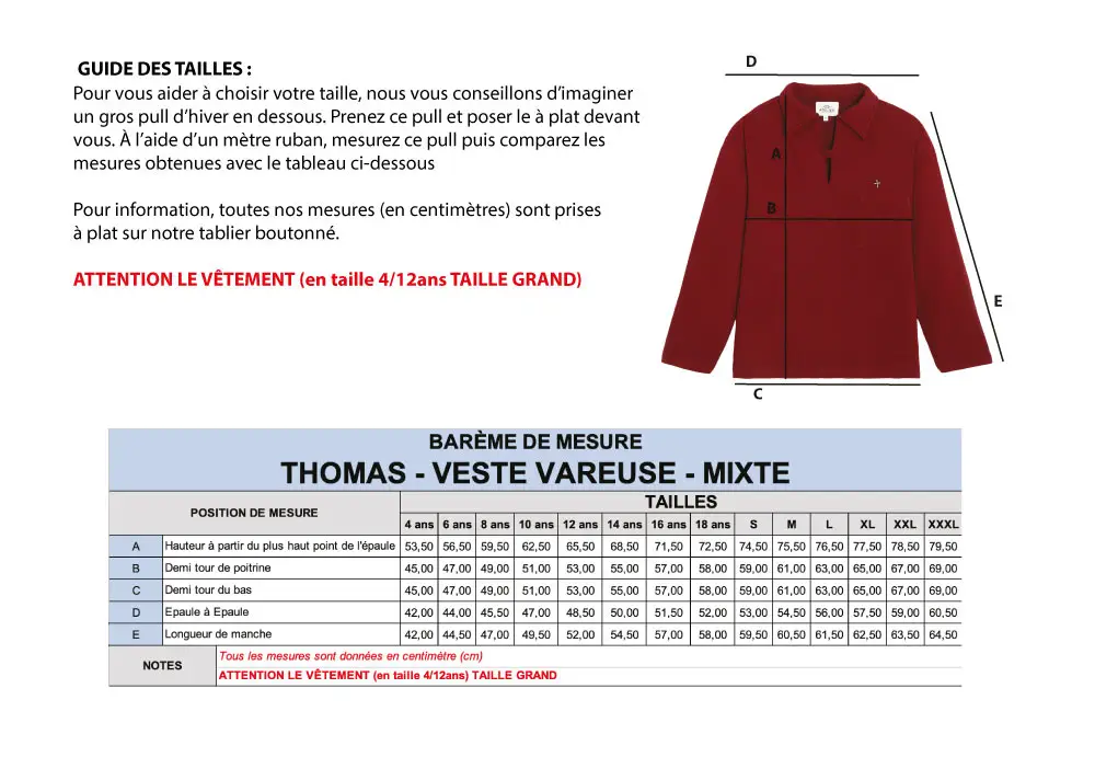 Vous hésitez entre deux tailles ? Notre veste vareuse en molleton THOMAS taille normalement. N’hésitez pas à vous référer à notre barème de mesures.